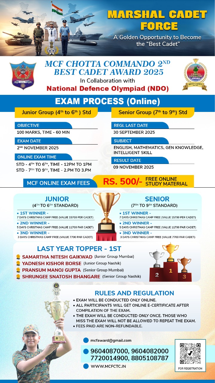 Marshal Cadet Force (MCF) was established under the Marshal Cadet Foundation on 20th November 2010. MCF has been recognized under the 21st Institution’s Registration Act of 1860 and the 29th Mumbai Trust Act of 1950. MCF is the first ever private institution in Maharashtra imparting pre-military / para-military training to children of age group 06 to 15 years, since the year 2010 and is equally competent with other such governmental institutions.